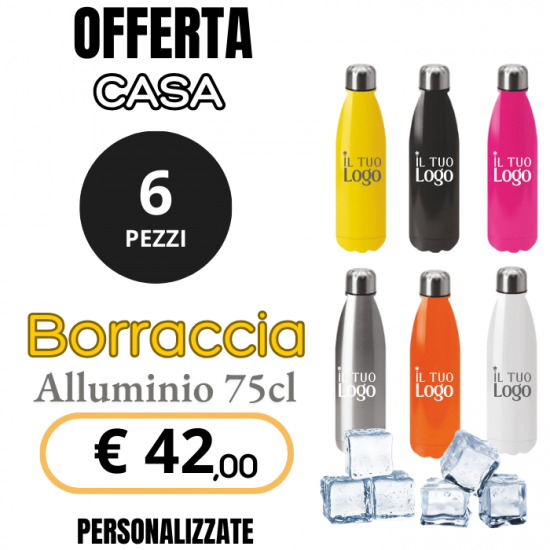 6 Borracce alluminio dalla capacità di 750ml. Sono acquistabili neutre o personalizzate, anche con incisione laser.